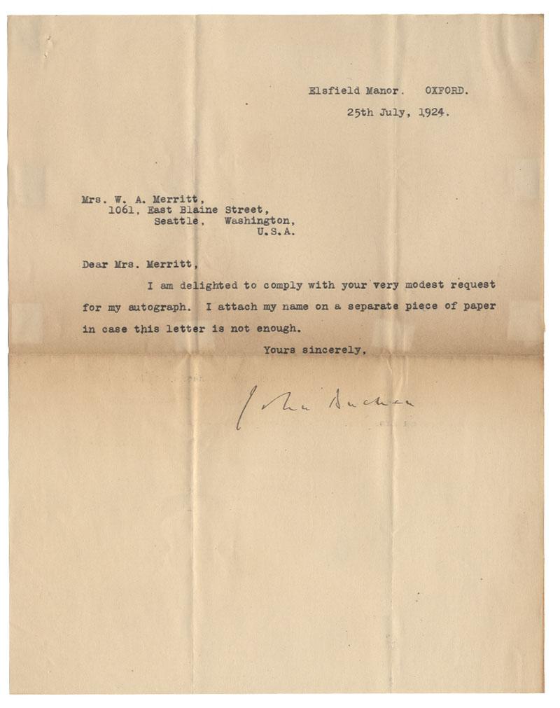 John Buchan, 1st Baron Tweedsmuir (1875 – 1940). British novelist and Unionist politician who, between 1935 and 1940, served as the Governor General of Canada. TLS. 1 page. 8 1/4" x 10 1/2". To Mrs. Merritt; "I am delighted to comply with your very modest request for my autograph. I attach my name on a separate piece of paper (not present) in case this letter is not enough. John Buchan". Some browning at center. Fine.