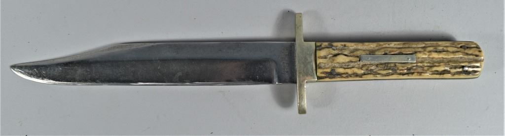 John Bull & Co. Sheffield England Stag Handled Hunting Knife. Fixed blade with engravable plate on handle. Excellent condition. 6 3/4 inch handle, 11 inches overall.