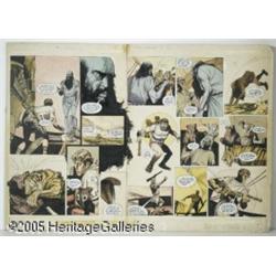 <B>John Burns - Boy's World V2#22 "Wrath of the Gods" Original Art (1964).</B></I> "Wrath of the Gods" told of the adventures of Arion, a resident of the Greek island of Delos, who was ordered by the Gods to find the "Bow of Delos." In this quest Arion met many mythical creatures -- the Minotaur, Proteus, Pegasus, and Atlas. Arion was accompanied by two companions, Pollodor and Klobbax. Here he encounters Andros who cursed Arion's shipmates so that they were transformed into beasts; Arion was forced to draw his crude rifle on Klobbax. The art is rendered in ink and watercolor on conjoined art boards. The conjoined image measures an overall 29" x 18". The boards are hinge-taped together on the reverse. There is some edge wear and chipped corners on the artboards; otherwise the art is in Very Good condition. Terrific, detailed art by British master, John Burns! A celebrated and tremendously talented artist, John M. Burns was renowned for his work on the super-sexy, long-running, British "good-girl" strip, <I>Jane</B></I>; he also illustrated the <I>Modesty Blaise</B></I> newspaper strip for a time. Don't miss out on this stunning showpiece by a comics legend!