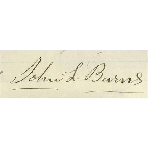 <B>John Burns, The Old Hero of Gettysburg, Letter Signed</B></I> "<I>John L. Burns</B></I>". Also known as the "One Man Army of Gettysburg," Burns was a seventy-year-old War of 1812 and Mexican War veteran who lived at Gettysburg. When the Civil War broke out, he was one of the first to volunteer, but was rejected because of his advanced years. When the rebels invaded the Cumberland Valley and started to march toward Gettysburg, he grabbed his old musket and started shooting. When he saw the troops carrying his beloved Stars and Stripes coming in, he ran to offer his services, ending up with a Wisconsin regiment. They soon recognized his expertise with a gun and replaced his old musket with a first-rate rifle and gave him 25 rounds of cartridges. He fired 18 of his rounds, killing three rebels (by his count) and receiving three wounds himself. He was left behind on the field. When the Confederates found him there in citizen's attire, he somehow managed to talk his way into being taken home and having his wounds treated. Stories of his bravery soon spread and he became a national folk hero, with articles and poems written about him. General Doubleday even entered the account of his actions into the official report. After the war, those touring the battlefield often visited him. Upon his death in 1871, the national press carried his obituary. <BR><BR>This lot contains a letter signed "<I>John L. Burns</B></I>". One page, 5" x 8", Gettysburg, March 30, 1864, apparently in reply to an autograph request, in part: "...Not being a good penman, I have a friend to answer for me, subscribing my own name." Fine condition, lightly mounted to a folder with a group of contemporary clippings. From the Henry E. Luhrs Collection. Accompanied by LOA from PSA/DNA.