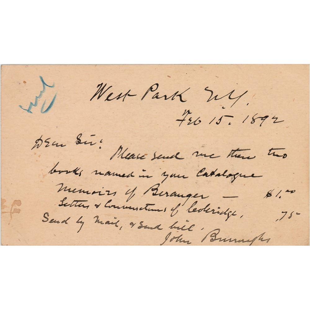 Famed American naturalist (1837–1921) best known for his writings on nature and travel. ALS, one page on a 5 x 3 postcard, February 15, 1892. Handwritten letter to bookseller A. S. Clark in New York City, in full: "Please send me these two books named in your catalogue: Memoirs of Beranger—$1.00, Letters & Commentaries of Coleridge—.75. Send by mail, & send bill." Addressed on the reverse in Burroughs's hand. In fine condition.