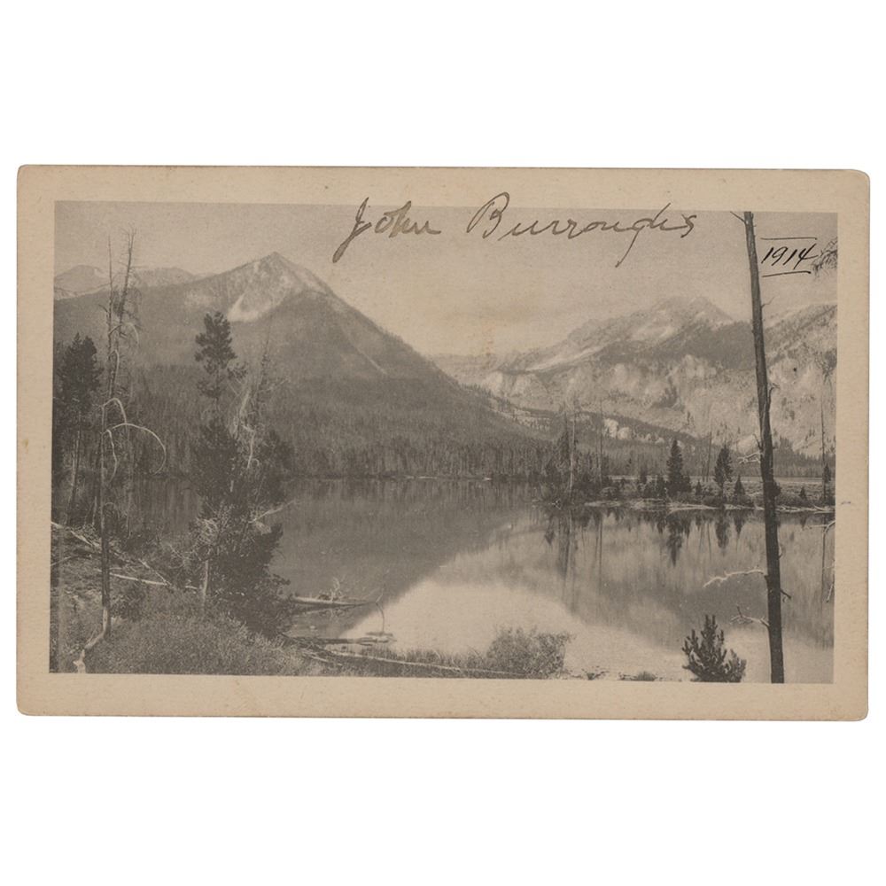 Attractive 5.5 x 3.5 postcard depicting a scenic mountain range, signed at the top in ink, "John Burroughs." Dated 1914 in another hand, and annotated on the reverse by a collector. In fine condition.