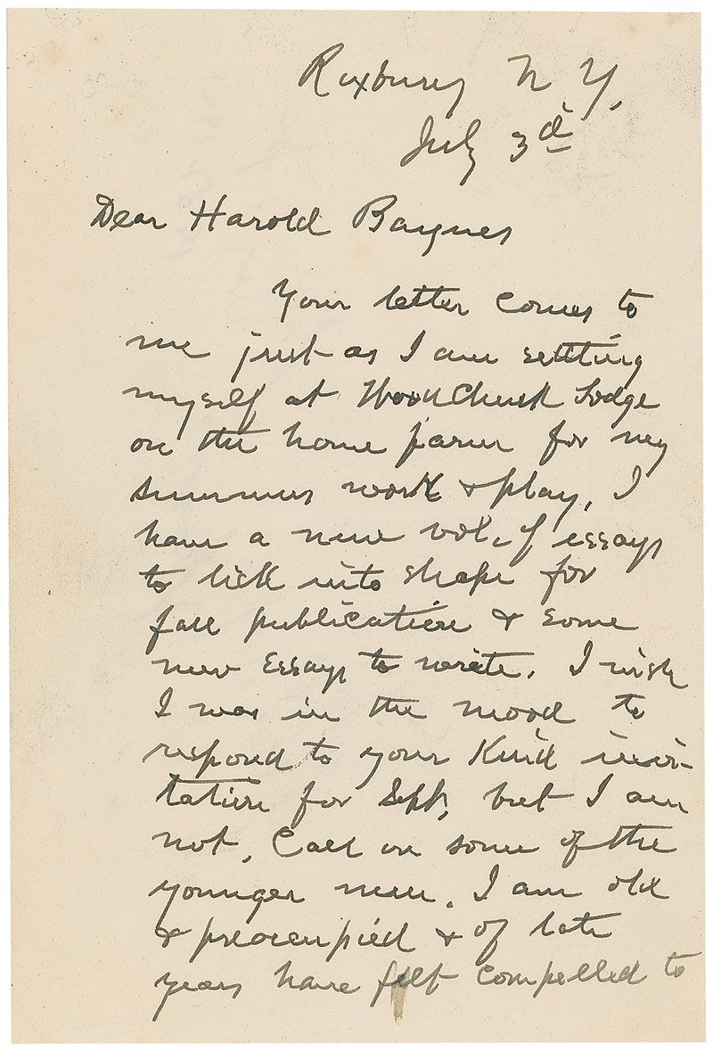 Famed American naturalist (1837–1921) best known for his writings on nature and travel. ALS, two pages, 4.75 x 7.25, July 3. Burroughs writes Harold Baynes. In full: “Your letter comes to me just as I am setting myself at Woodchuck Lodge on the home farm for my summer’s work & play. I have a new vol. of essays to lick into shape for fall publication & some new essays to write. I wish I was in the mood to respond to your kind invitation for Sept. but I am not. Call on some of the younger men. I am old & preoccupied & of late years have felt compelled to decline all invitations of a public character. I can keep well & do my work on no other conditions. I have fought my battle for the birds by trying to awaken an interest in them; now you younger men do well to enlist the public in helping establish bird sanctuaries etc. You have my sympathy & hearty good will. Sometime I am sure I shall come your way & see what you have done.” In fine condition, with intersecting folds, a few spots of toning, and a brush to one word on the first page.