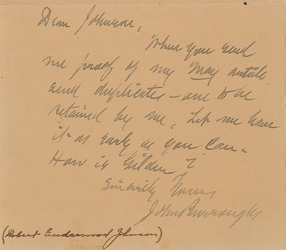 Famed American naturalist (1837–1921) best known for his writings on nature and travel. ALS, one page, 5.5 x 4.75, no date. Letter to Robert Underwood Johnson. In full: “When you send me proof of my May article, send duplicates—one to be retained by me. Let me have it as early as you can. How is Gilder?” Affixed to a same-size card. Intersecting folds slightly affecting the signature, a moderate overall shade of toning, and an ink notation to the bottom, otherwise fine condition.