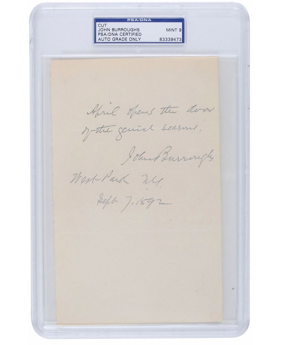 Famed American naturalist (1837–1921) best known for his writings on nature and travel. AQS on an off-white 5 x 8 sheet, signed “John Burroughs, West Park, N. Y., Sept. 7, 1892.” Burroughs pens an appropriately outdoorsy sentiment. In full: “April opens the don of the genial seasons.” Encapsulated in a plastic PSA/DNA authentication and grading holder, evaluating the signature at ‘9.’ In fine condition.