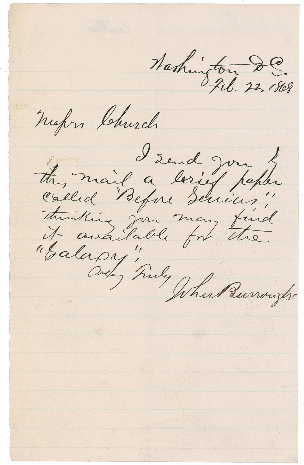Famed American naturalist (1837–1921) best known for his writings on nature and travel. ALS, one page, lightly-lined, 5 x 8, February 22, 1868. Short letter to Mr. Church. In full: “I send you by this mail a brief paper called ‘Before Genius,’ thinking you may find it available for the ‘Galaxy.’” In fine condition, with a central vertical fold, and some scattered light toning and soiling.