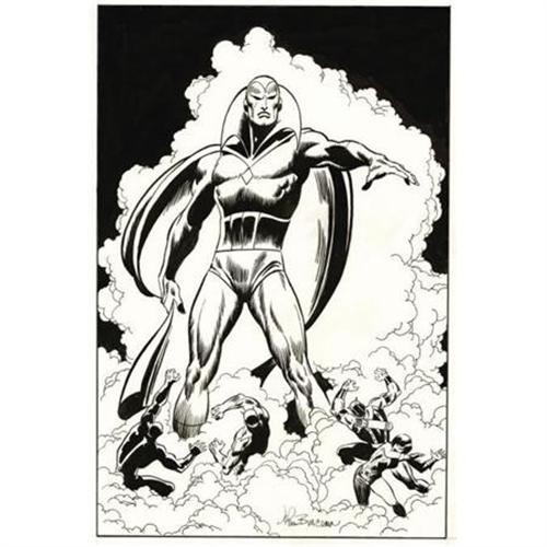 <B>John Buscema - Avengers #57 Cover Recreation Original Art (undated). </B></I> Behold ...the Vision. John Buscema recreated one of his most striking covers from the late Silver Age, and arguably one of his most popular Marvel Comic covers ever, spotlighting the first Silver Age appearance of the Vision. The image area of this art measures 10" x 15", and the work is in Excellent condition. John Buscema inked the art and signed the piece at the lower center. <BR><BR> <BR><BR><b>Shipping:</b> Flat Material, Small (<a target="_blank" href="http://www.heritageauctions.com/common/shipping.php">view shipping information</a>)