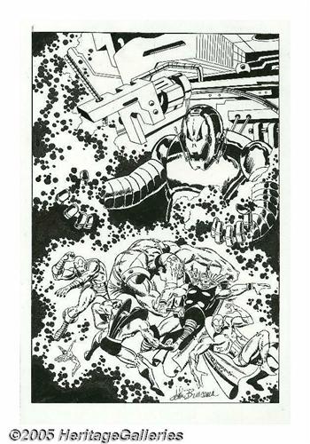 <B>John Buscema - Avengers #67 Cover Recreation Original Art (undated).</B></I> Big John Buscema pays a terrific tribute to his brother Sal with this faithful recreation of the scintillating cover scene of <B>Avengers</B></I> #67. "We Stand At Armageddon" was an electrifying extravaganza as Ultron-6 taunted the heroes with the command, "Die Avengers Die!" Answering the battle call are Iron Man, Wasp, Goliath, Yellow Jacket, Thor, and the Vision. The art has an image area of 10.5" x 15", and this gorgeous piece is in Excellent condition. John Buscema signed the art at the lower right.