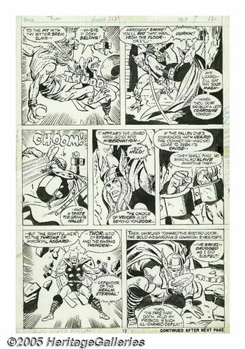 <B>John Buscema, Don Perlin, and Vince Colletta - Thor #213, page 12 Original Art (Marvel, 1973).</B></I> Even shackled, the Mighty Thor, defender of the realm eternal, proves himself to be more than a match for his lizard-men captors in a thrilling scene from "The Demon Brigade!" John Buscema's talent for figure drawing is showcased in this all-out action page, finished by Marvel mainstays Don Perlin and Vince Colletta. The image area of the page is 10" x 15", and the art is in Excellent condition.