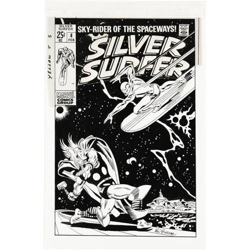 <B>John Buscema - Silver Surfer #4 Cover Recreation Original Art (undated).</B></I> John Buscema recreates one of the most famous covers from the late Silver Age, and arguably one of his most popular Marvel Comic covers ever, in this cover recreation of <B>Silver Surfer</B></I> #4. The image area measures 10" x 15", and the work includes a facsimile of the title logo and masthead on an acetate overlay. In Excellent condition and signed by John Buscema at the bottom right. <BR><BR><B>Important notice:</B> Heritage usually auctions material at the rate of 200-250 lots per hour. On some occasions eBay Live bid software or the Internet may not be able to keep up with the pace of the auction. We recommend placing a realistic absentee bid now as insurance to avoid disappointment. Occasionally the auctioneer may eliminate or reject an eBay Live bid, and the auctioneer may also reopen a lot after the close of the eBay live bidding (usually because we missed an audience bid), and may reject your bid even if it shows you as the winning bidder. By bidding via eBay Live, you agree that Heritage may award the lot to another bidder at its sole discretion under the circumstances described above or any other reasonable circumstances. Since eBay bids are not shown to us until we open the lot on the floor, we treat those bids just like floor bids. In most cases the floor responds before the eBay bid is presented to us, due to Internet lag time, so for consistency we have made it a policy that floor bids are always considered first over tie eBay live bids. Also please note that all Heritage lots purchased through eBay Live carry a 22.5% Buyer's Premium. Please make sure you read the Terms and Conditions before you bid. This lot is being auctioned in conjunction with a live floor auction by Heritage Auction Galleries. All final auction and invoice information will be supplied by Heritage Auction Galleries, and all other information should be considered preliminary. Lot:41001 <BR><BR><B>Winning Notification and Billing:</B> After the FINAL session in this auction is complete, Heritage will send e-mail and snail mail invoices. This process normally takes several days. All final auction and invoice information will be supplied by Heritage Auction Galleries, and all other information should be considered preliminary. <BR><BR>This auction will be conducted on a live auction floor and over the Internet through eBay Live. If you choose to place an absentee bid, please take a moment to <font color='#0000ff'><u><a href='http://pages.ebay.com/liveauctions/help/before/laabsentee.html'>learn how eBay Live absentee bidding works</a></u></font><font color='#000000'>