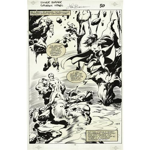<B>John Buscema and Vince Mielcarek - Silver Surfer: Judgment Day, page 52 Original Art (Marvel, 1988).</B></I> The stakes of the game get higher when Mephisto's scheme draws the attention of the world-devouring Galactus, in this page from Stan Lee and John Buscema's 64-page graphic novel. No one captured the majesty of the Silver Surfer like Big John Buscema! The image area measures 10" x 15" and the condition is Very Good. Signed by John Buscema along the top edge. <BR><BR><B>Important notice:</B> Heritage usually auctions material at the rate of 200-250 lots per hour. On some occasions eBay Live bid software or the Internet may not be able to keep up with the pace of the auction. We recommend placing a realistic absentee bid now as insurance to avoid disappointment. Occasionally the auctioneer may eliminate or reject an eBay Live bid, and the auctioneer may also reopen a lot after the close of the eBay live bidding (usually because we missed an audience bid), and may reject your bid even if it shows you as the winning bidder. By bidding via eBay Live, you agree that Heritage may award the lot to another bidder at its sole discretion under the circumstances described above or any other reasonable circumstances. Since eBay bids are not shown to us until we open the lot on the floor, we treat those bids just like floor bids. In most cases the floor responds before the eBay bid is presented to us, due to Internet lag time, so for consistency we have made it a policy that floor bids are always considered first over tie eBay live bids. Also please note that all Heritage lots purchased through eBay Live carry a 22.5% Buyer's Premium. Please make sure you read the Terms and Conditions before you bid. This lot is being auctioned in conjunction with a live floor auction by Heritage Auction Galleries. All final auction and invoice information will be supplied by Heritage Auction Galleries, and all other information should be considered preliminary. Lot:41001 <BR><BR><B>Winning Notification and Billing:</B> After the FINAL session in this auction is complete, Heritage will send e-mail and snail mail invoices. This process normally takes several days. All final auction and invoice information will be supplied by Heritage Auction Galleries, and all other information should be considered preliminary. <BR><BR>This auction will be conducted on a live auction floor and over the Internet through eBay Live. If you choose to place an absentee bid, please take a moment to <font color='#0000ff'><u><a href='http://pages.ebay.com/liveauctions/help/before/laabsentee.html'>learn how eBay Live absentee bidding works</a></u></font><font color='#000000'>