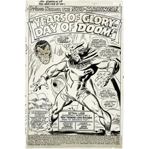 <B>John Buscema and Frank Giacoia - The Sub-Mariner #1 Splash Page 1 Original Art (Marvel, 1968).</B></I> Imperius Rex! Subby's got his own mag at last -- if he lives to enjoy it. Long-time Marvel fans will get a real charge out of this milestone splash, from the debut issue of Prince Namor's Bronze Age title. From the yarn, "Years of Glory -- Day of Doom," written by Roy "the Boy" Thomas, this splash features the diabolical Destiny gloating over the defeat of his arch-enemy. Meanwhile, a visage of the Sub-Mariner lingers to haunt him. The portrait of the Sub-Mariner is a pasted-on stat. The image area of the splash measures 10" x 15", and the art is in Very Good condition.