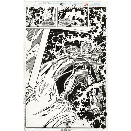 <B>John Buscema and Scott Koblish - Doom 2099 #40, Splash page 13 Original Art (Marvel, 1996).</B></I> The Dr. Doom of 1996 finally meets his mysterious foe - Doom 2099 - in this commanding page from the story, "Rage Against Time I: Visitation," written by Tom Peyer. The image area measures 10" x 15", and the condition is Excellent. Signed by John Buscema at the bottom. <BR><BR><B>Important notice:</B> Heritage usually auctions material at the rate of 200-250 lots per hour. On some occasions eBay Live bid software or the Internet may not be able to keep up with the pace of the auction. We recommend placing a realistic absentee bid now as insurance to avoid disappointment. Occasionally the auctioneer may eliminate or reject an eBay Live bid, and the auctioneer may also reopen a lot after the close of the eBay live bidding (usually because we missed an audience bid), and may reject your bid even if it shows you as the winning bidder. By bidding via eBay Live, you agree that Heritage may award the lot to another bidder at its sole discretion under the circumstances described above or any other reasonable circumstances. Since eBay bids are not shown to us until we open the lot on the floor, we treat those bids just like floor bids. In most cases the floor responds before the eBay bid is presented to us, due to Internet lag time, so for consistency we have made it a policy that floor bids are always considered first over tie eBay live bids. Also please note that all Heritage lots purchased through eBay Live carry a 22.5% Buyer's Premium. Please make sure you read the Terms and Conditions before you bid. This lot is being auctioned in conjunction with a live floor auction by Heritage Auction Galleries. All final auction and invoice information will be supplied by Heritage Auction Galleries, and all other information should be considered preliminary. Lot:41001 <BR><BR><B>Winning Notification and Billing:</B> After the FINAL session in this auction is complete, Heritage will send e-mail and snail mail invoices. This process normally takes several days. All final auction and invoice information will be supplied by Heritage Auction Galleries, and all other information should be considered preliminary. <BR><BR>This auction will be conducted on a live auction floor and over the Internet through eBay Live. If you choose to place an absentee bid, please take a moment to <font color='#0000ff'><u><a href='http://pages.ebay.com/liveauctions/help/before/laabsentee.html'>learn how eBay Live absentee bidding works</a></u></font><font color='#000000'>