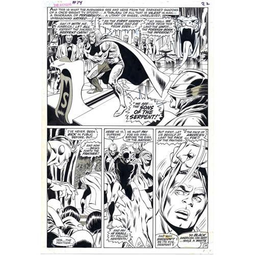 <B>John Buscema and Tom Palmer - The Avengers #74, page 17 Original Art (Marvel, 1970).</B></I> By the mid-70s, "Big" John Buscema's work was the standard others strove for, and it came as no surprise when Buscema was tapped to co-create <B>How to Draw Comics the Marvel Way</B></I>. By then, Buscema's style had supplanted Jack Kirby's -- he <I>was</B></I> the "Marvel Way". Buscema's rock-solid pencils, and Tom Palmer's inks, bring this Sons of Serpent-filled tableau to life, from the story, "Pursue the Panther," written by Roy Thomas. This page has an image area of 10.5" x 15", and, aside from a light stain along the bottom left edge, the condition is Very Good.