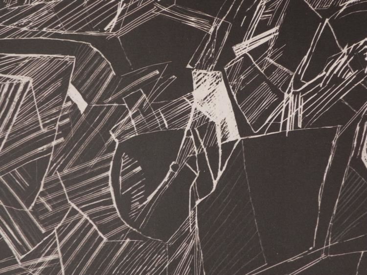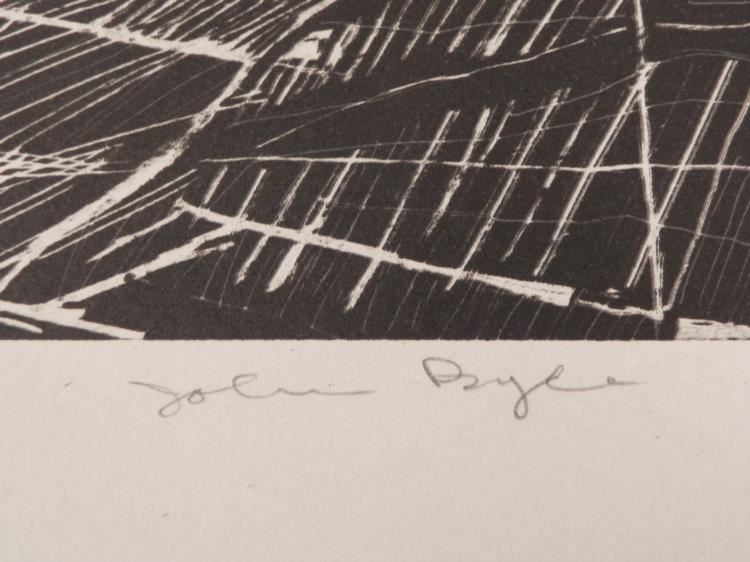 This is a fine abstract, busy with contrasting lines and forms. Artist: John Byle Signature: In pencil, lower right Medium: Lithograph on rag paper Edition: Unnumbered, dedicated artist's proof, marked "Michel with much appreciation" in pencil, lower center Sheet size: 21 1/2 x 18 inches Condition: Excellent Biography:John Byle (1928- ) studied art at Olivet College in 1946, but didn t graduate until 1966. After WWII he left the United States for Israel, even though he was not Jewish. With the goal of building a new world, his idealism inspired much of his art as well. He moved to Tel Aviv and began teaching art. Byle s works have been exhibited widely, including at the Israel Museum, The Tel Aviv Museum and the Victoria and Albert Museum in London.