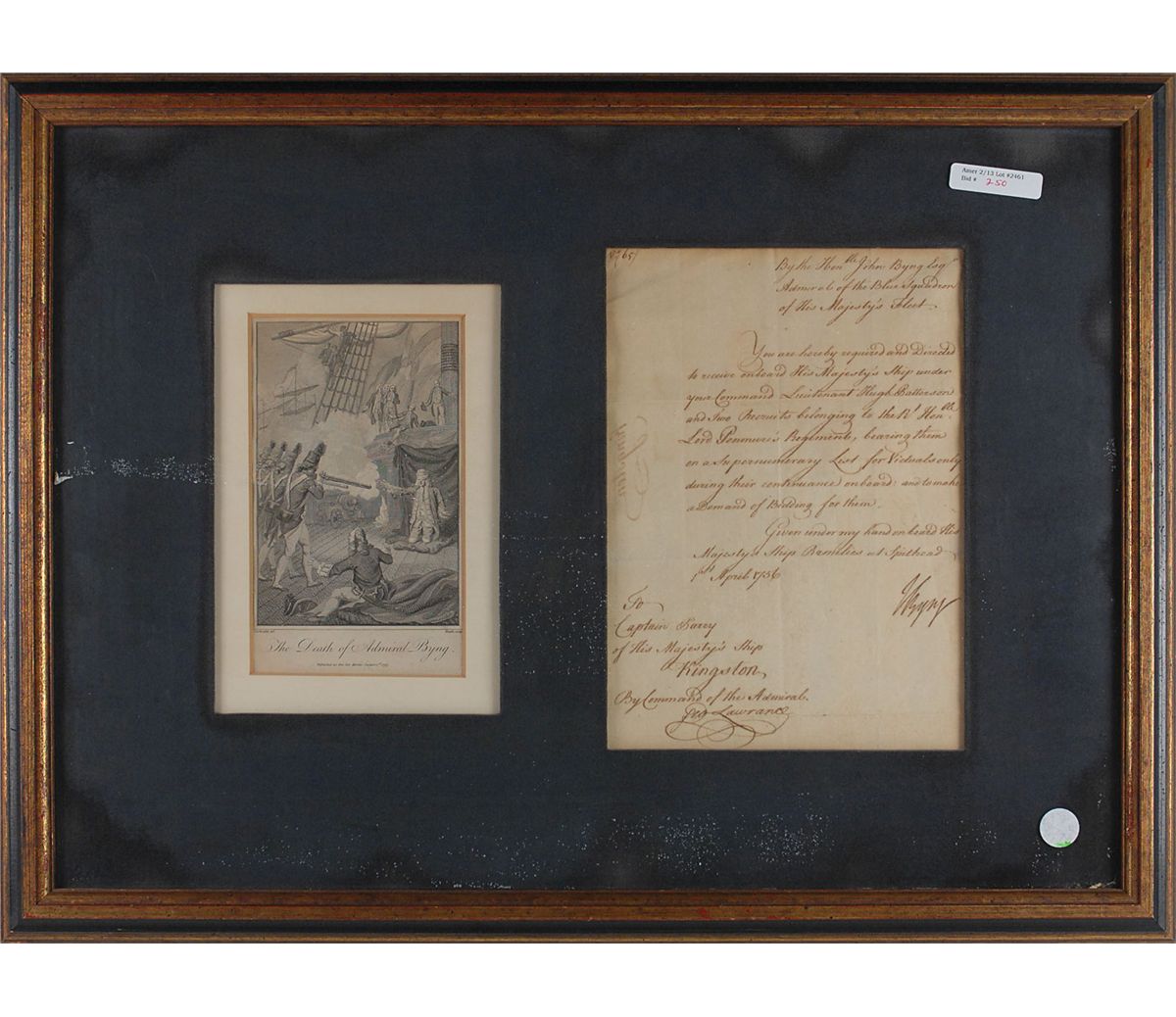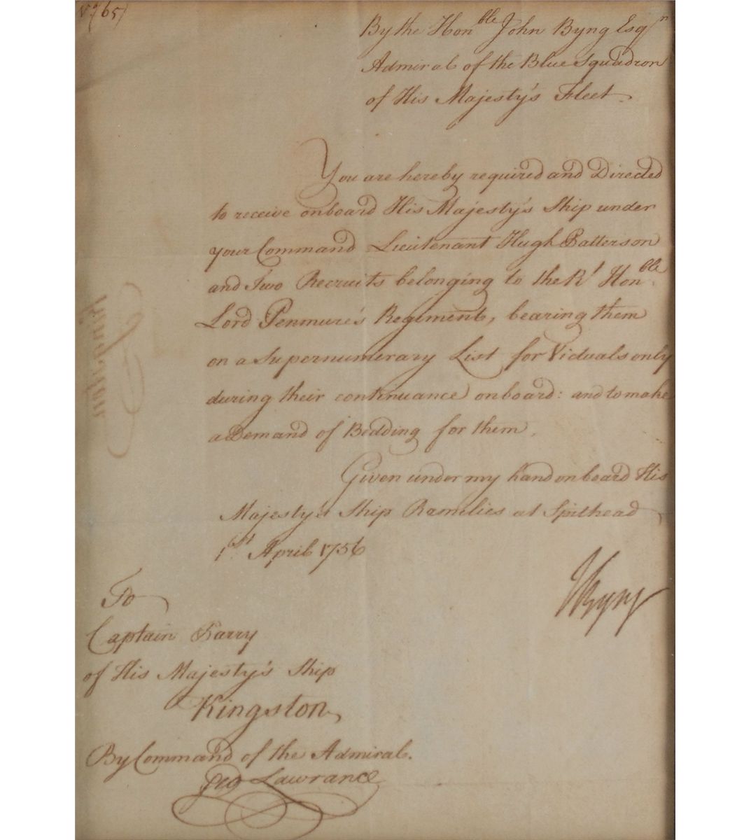 Royal navy officer (1704–1757) whose loss of Minorca at the beginning of the Seven Years’ War led to his execution. Incredibly rare manuscript DS, signed “J Byng,” one page, 6.75 x 9.75, April 1, 1756. Document sent from his flagship at Spithead, shortly before setting sail on his fateful mission to Minorca, issuing orders to Capt. Barry aboard the Kingston. In full: “You are hereby required and directed to receive onboard His Majesty's ship under your command Lieutenant Hugh Batterson and two recruits belonging to the Rt. Honorable Lord Panmure's regiment, bearing them on a supernumerary list for victuals only during their continuance onboard; and to make a demand for bedding for them." Cloth-matted and framed with an engraving of Byng’s execution to an overall size of 22.25 x 17. In fine condition, with intersecting folds and some light show-through from docketing on reverse along left edge.