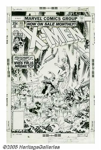 <B>John Byrne and Bob Layton - X-Men #113 Cover Original Art (Marvel, 1978).</B></I> Face front True Believers, and feast your eyes on John Byrne's scintillating first-published X-Men cover, as inked by Bob Layton. What a premiere! -- the X-Men launched an all-out battle royal against Magneto in the thriller, "When Falls Magneto." The tableau showcased Cyclops, Colossus, Banshee, Storm, Wolverine, Phoenix, and Nightcrawler as the team launched their supreme offensive against Magneto. John Byrne remarked in Ron Goulart's <B>The Great Comic Book Heroes</B></I>, "When I started doing comics I realized that I didn't have the sense of power that say, Jack Kirby has, or the understanding of anatomy that Gil Kane has. So, I decided that I'd try to make my work a little different -- try to make it stand out because it was subtle, because an expression or pose or gesture had a certain degree of subtlety." It was on the <B>X-Men</B></I> title that John Byrne solidified this approach. He not only drew the feature, but also contributed to plot and characterization, and was a key factor in the growing popularity of Phoenix and Wolverine. The image area of the cover measures 9.75" x 15", and the art is in Excellent condition. Don't miss out on your chance to win this John Byrne milestone!