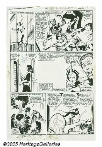 <B>John Byrne and Terry Austin - The Uncanny X-Men #141, page 15 Original Art (Marvel, 1981).</B></I> John Byrne and Chris Claremont hit another one out of the park on this 2-issue story arc, "Days of Future Past," (<B>Uncanny X-Men</B></I> #141-142), near the end of their amazing run on the series. In it, they bring us into a dark future where the Sentinels have obliterated nearly all superheroes and a few remaining send an adult Kitty Pryde back to the present to prevent this nightmare from happening. In this page from issue #141, reality twists inside-out for Kitty Pryde, as she comes face-to-face with older, wiser self. The image area measures 10" x 15," and aside from some trimmed edges and corners (done during the printing process), and the art is in Excellent condition. Signed by Chris Claremont and John Byrne.