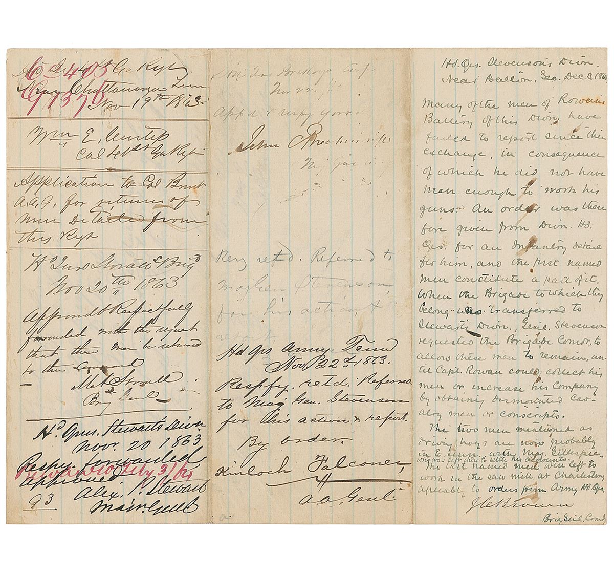 Civil War–dated endorsement signature, “John C. Breckenridge,” penned on the reverse docketing panel of a document by William E. Curtiss concerning the transfer of soldiers between divisions, one page, 7.5 x 9.5, November 19, 1863. Breckinridge approves the request, which is also endorsed by M. A. Stovall, Alexander P. Stewart, Kinloh Falconer, and J. C. Brown. Expected document wear, light soiling, and portions of the signature a few shades light, otherwise fine condition.