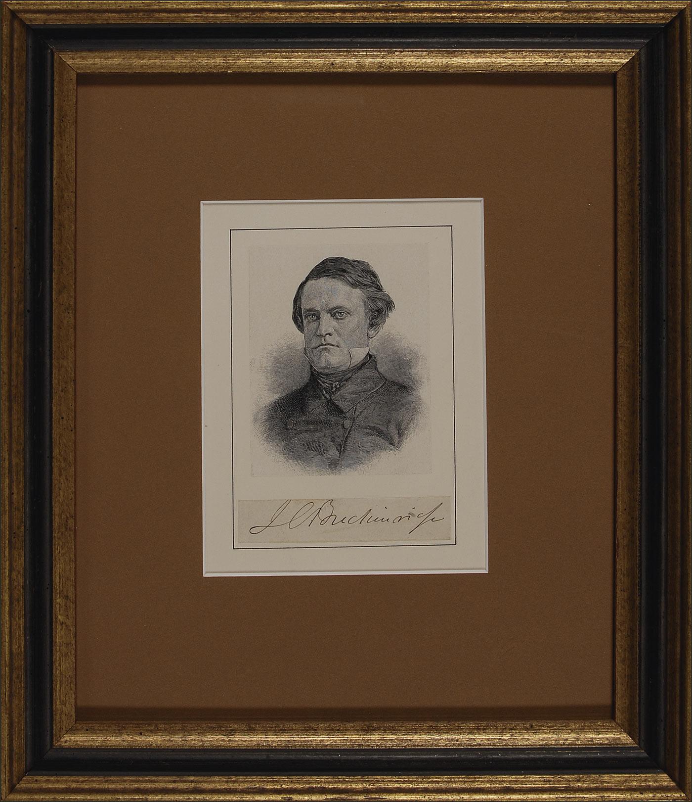 Ink signature, “J. C. Breckinridge,” on an off-white 3 x .75 slip. Matted with a small portrait to an overall size of 9.5 x 11. In fine condition, with trimming close to the tops of the capital letters.