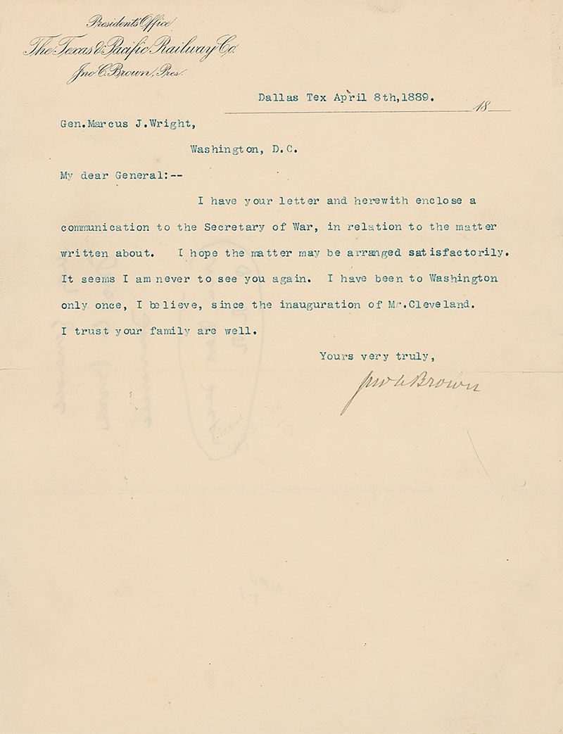 Confederate general during the Civil War and the Governor of Tennessee from 1871 to 1875, the first Democrat to be elected to that position following the war (1827–1889). TLS signed “Jno. C. Brown,” one page, 8.25 x 11, President’s Office, The Texas & Pacific Railway Co. letterhead, April 8, 1889. Letter to General Marcus Wright. In part: “I have your letter and herewith enclose a communication to the Secretary of War…It seems I am never to see you again. I have been to Washington only once, since the inauguration of Mr. Cleveland.” Partial separations along intersecting mailing folds and one vertical fold passing through a single letter of the signature, otherwise fine condition.