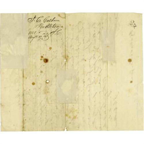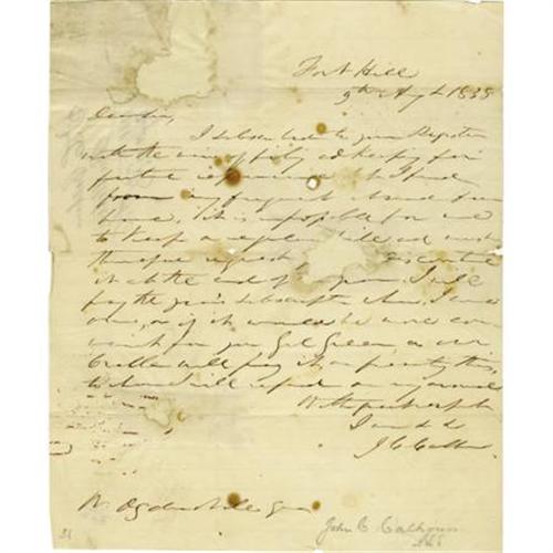 <B>John C. Calhoun Autograph Letter Signed</B></I> “<I>J. C. Calhoun</B></I>”. One page, 8” x 9.75”, Fort Hill, August 9, 1838, to Mr. Ogden Niles, with endorsements on the verso. This letter finds John C. Calhoun (1782-1850) attending to a task common to all of us: canceling a subscription. Calhoun cancels his subscription due “<I>my frequent absences from home</B></I>”. Calhoun's varied political career ranged from serving as vice-president under Presidents John Adams and Andrew Jackson, a Secretary of State and a Secretary of War. Calhoun was a radical proponent of slavery calling it a “positive good”. The letter has been repaired with archive tape and is soiled and stained in several spots, else good condition. <I>From the collection of Henry E. Luhrs.</B></I><BR><BR><b>Shipping:</b> Flat Material, Small (<a target="_blank" href="http://www.heritageauctions.com/common/shipping.php">view shipping information</a>)