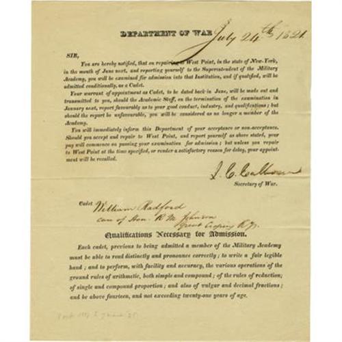 <B>John C. Calhoun Document Signed</B></I> "<I>J.C. Calhoun</B></I>" as Monroe's Secretary of War, one page, 7.75" x 9.5". Department of War [Washington]. July 24, 1821. A printed form, signed by Calhoun in ink, addressed to Cadet "<I>William Radford/care of Hon. R M Johnson/Great Crossing Ky.</B></I>" In part, "<I>You are hereby notified, that on repairing to West Point, in the state of New-York, in the month of June next, and reporting yourself to the Superintendent of the Military Academy, you will be examined for admission into that Institution, and if qualified, will be admitted conditionally, as a Cadet...</B></I>" The lower portion of Calhoun's letter is headed "<I>Qualifications Necessary for Admission</B></I>." In part, "<I>Each cadet...must be able to read distinctly and pronounce correctly; to write a fair legible hand; and to perform, with facility and accuracy, the various operations of the ground rules of arithmetic, both simple and compound...and be above fourteen, and not exceeding twenty-one years of age</B></I>." John C. Calhoun was Monroe's Secretary of War from 1817-1825, Vice President under J.Q. Adams and Jackson (1825-1832), Tyler's Secretary of State (1844-1845), and U.S. Senator from South Carolina (1832-1843, 1845-1850). Richard M. Johnson represented Kentucky in the House of Representatives (1807-1819, 1829-1837) and U.S. Senate (1819-1829) and served as Van Buren's Vice President (1837-1841). Fine condition.<BR><BR><b>Shipping:</b> Flat Material, Small (<a target="_blank" href="http://www.heritageauctions.com/common/shipping.php">view shipping information</a>)