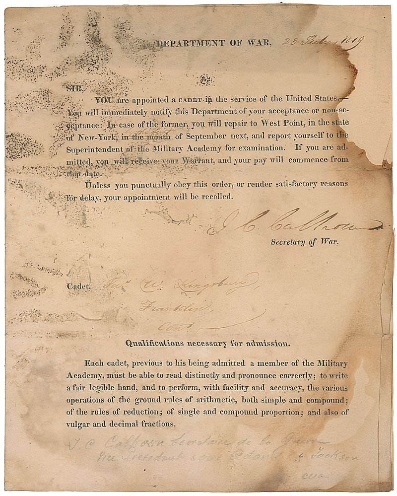 Prominent American politician (1782–1850) who served as vice president under John Quincy Adams and Andrew Jackson and later wielded great power and influence in the Senate as a champion of Southern causes, including slavery. DS, signed “J. C. Calhoun,” one page, 8 x 9.75, July 23, 1819. Secretary of War Calhoun informs W. Kingsbury of his acceptance to West Point. In part: “You are appointed a cadet in the service of the United States—You will immediately notify this Department of your acceptance or non-acceptance: In case of the former, you will repair to West Point.” In good to very good condition, with heavy overall foxing and staining.