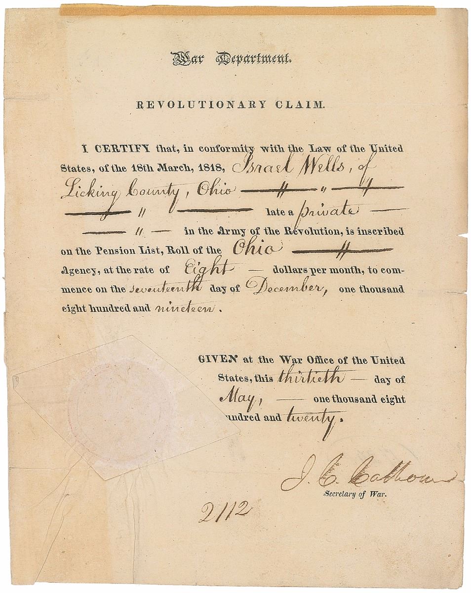 Partly-printed DS, signed “J. C. Calhoun,” one page, 7.75 x 9.75, War Department letterhead, May 30, 1820. Calhoun, as Secretary of War, signs a revolutionary claim granting Israel Wells, “a Private in the Army of the Revolution,” a pension “at the rate of eight dollars per month.” The white seal affixed to the lower left remains intact, with slight creasing and toning. In very good condition, with slight brushing to signature, tape-repaired partial separations to horizontal folds (one fold passing through the signature), a toned strip of tape to top edge, and some toning and chips to edges.