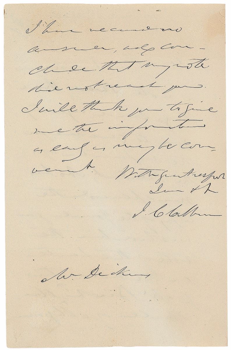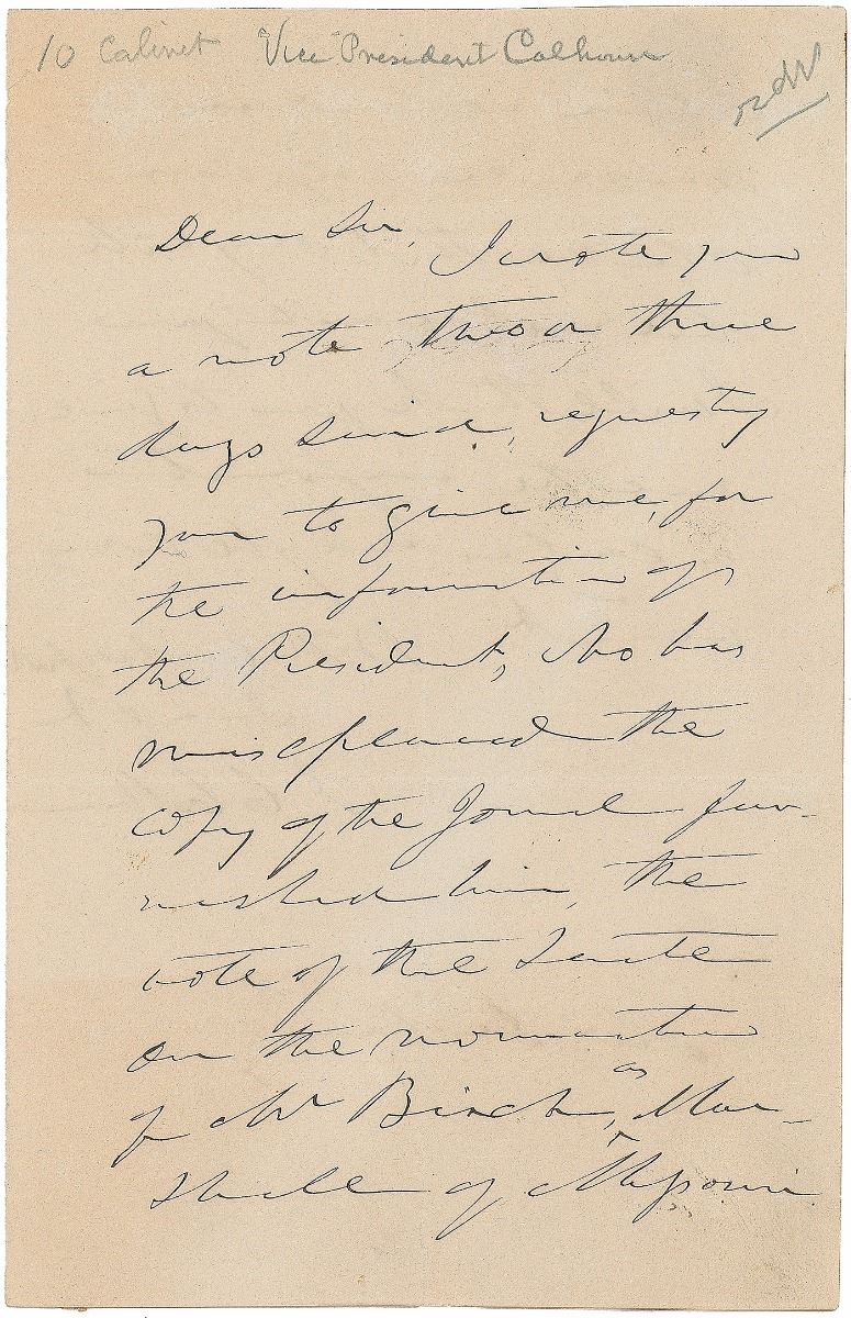 ALS as vice president, signed “J. C. Calhoun,” one page, 4.5 x 7, no date. Letter to W. Dickens, in part: “I wrote you a note two or three days since requesting you to give me, for the information of the President, who has misplaced the copy of the Journal forwarded him, the vote of the Senate on the nomination of Mr. Birch.” Reverse of the second integral page addressed in Calhoun’s own hand. In fine condition, with paper loss and mounting remnants to reverse of second integral page.