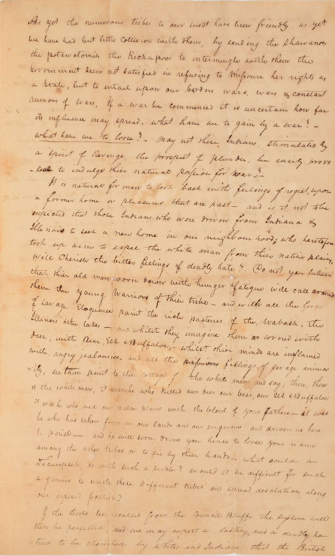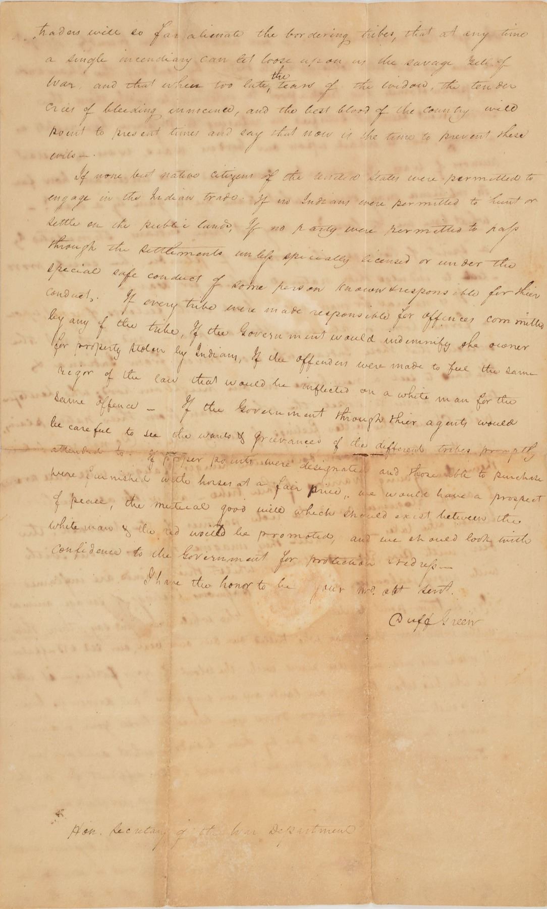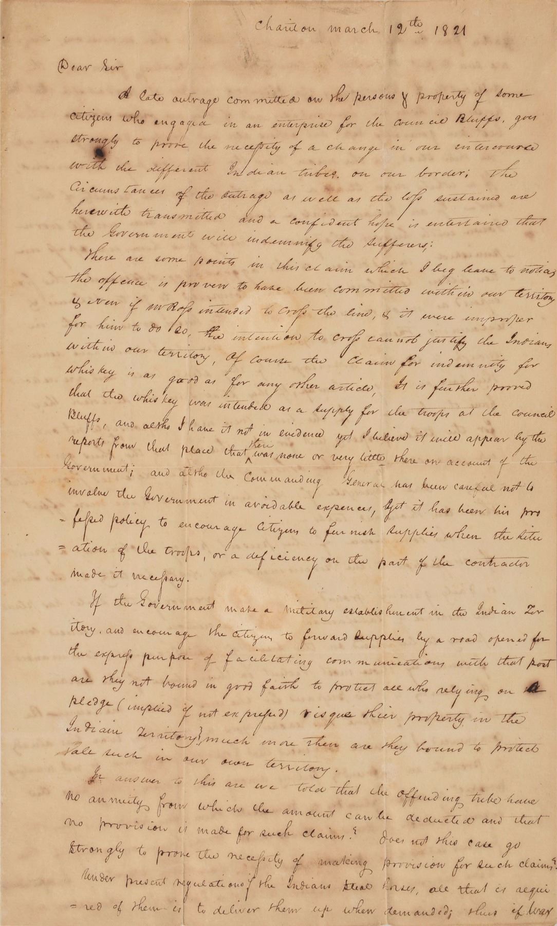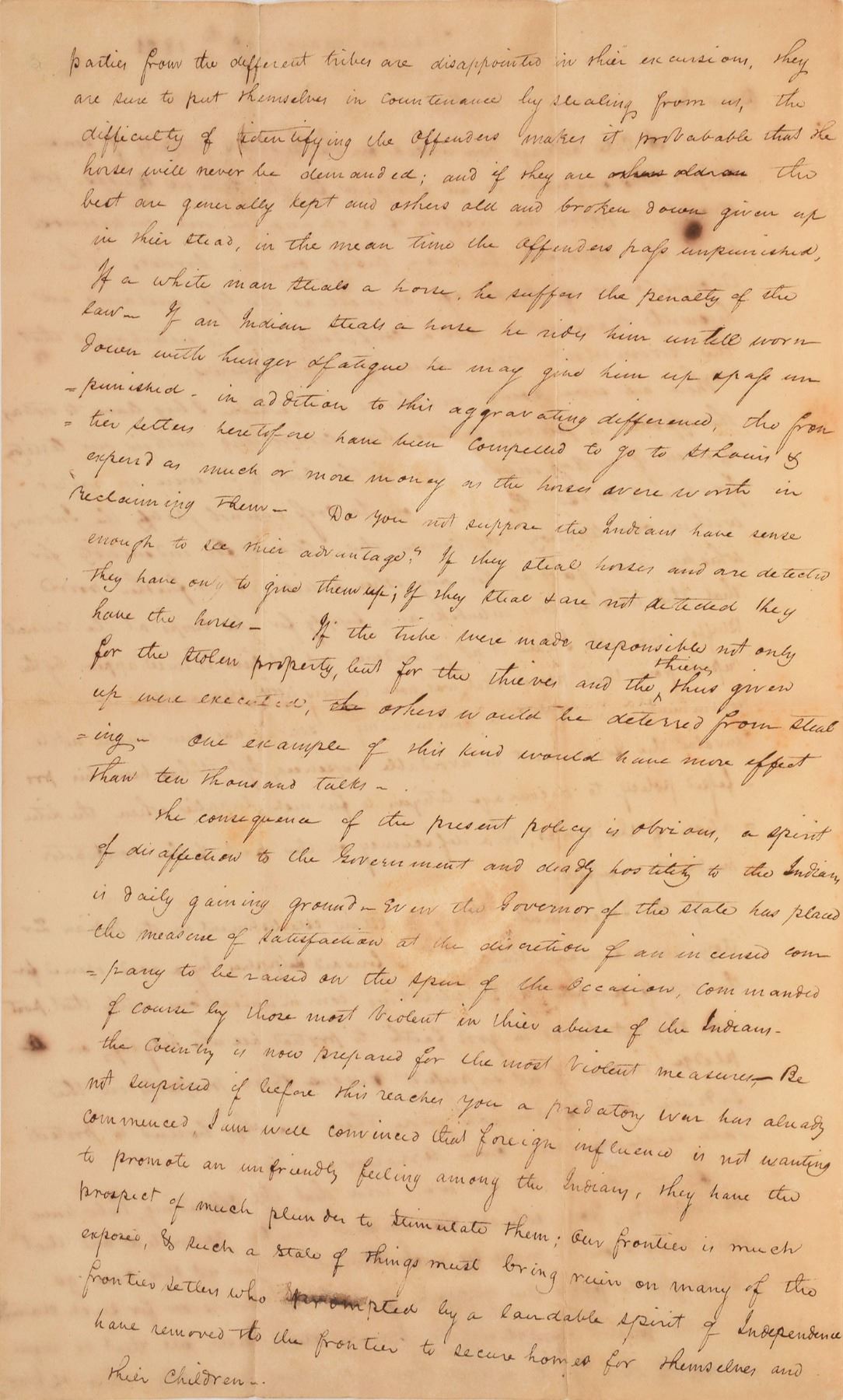In answer to this are we told that the offending tribe have no annuity from which the amount can be deducted and that no provision is made for such claims. Does not this case go strongly to prove the necessity of making provision for such claims? Under present regulations if the Indians steal horses, all that is required of them is to deliver them up when demanded; thus if war parties from the different tribes are disappointed in their excursions, they are sure to put themselves in countenance by stealing from us, the difficulty of identifying the offenders makes it probable that the horses will never be demanded; and if they are the best are generally kept and others old and broken down given up in their stead, in the mean time the offending pass unpunished. If a white man steals a horse, he suffers the penalty of the law - If an Indian steals a horse he rides him untill worn down with hunger & fatigue, he may give him up & pass unpunished—in addition to this aggravating difference, the frontier setlers heretofore have been compelled to go to St Louis & expend as much or more money as the horses were worth in reclaiming them—Do you not suppose the Indians have sense enough to see their advantage? If they steal horses and are detected they have only to give them up; if they steal & are not detected they have the horses—If the tribe were made responsible not only for the stolen property, but for the thieves and the thieves thus given up were executed, the others would be detered from stealing—one example of this kind would have more effect than ten thousand talks.” Includes a full transcript of the letter. In very good condition, with overall toning and light staining.