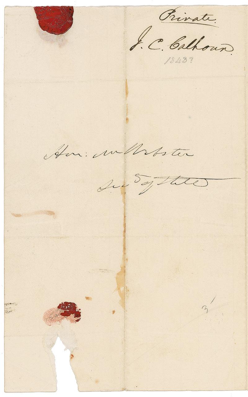 ALS signed “J. C. Calhoun,” one page, 5 x 8, no date. Short letter to Daniel Webster. In full: “I will call at the State Department tomorrow at the time you mention in your note.” Second integral page bears an address panel in Calhoun’s hand. Intersecting folds, and scattered light creases. Also a vertical fold bisecting address panel, as well as red wax seal remnant and docket, otherwise fine condition. Pre-certified PSA/DNA and RRAuction COA.