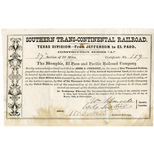 <B>John C. Fremont Document Signed</B></I> <I>"J.C. Fremont."</B></I> This 8" x 5.5" document is a bond for $1000 due to John C. Fremont upon the surrender of his 50 acres of land on the 37th section of the Southern Trans-Continental Railroad. This section would consist of 20 miles. Bonds like this were used to help fund the large undertaking. Fremont's goal was to unite Texarkana to Jefferson, Texas. This project failed and the first Trans-Continental Railroad through Texas was not finished until 1881. Fremont was one of the leading proponents this endeavor. His signature can be found on the reverse of this document in bold, dark ink. <BR><BR> Our document is in fine condition, with mild staining around the edges from water or smoke damage; there are also several vertical hard creases. Railroads were the "dreams come to life" of men who wanted to see the continent united. Even if their initial attempts failed, in time the coasts and states were linked by a system of rails that would eventually bring about the completion of Manifest Destiny. Bonds like this one made it possible for these railroads to be funded. Mr. Fremont was one of the men who kept these projects alive. A great document!