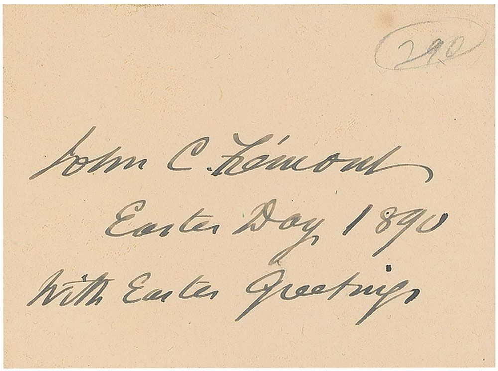Fountain pen signature, “John C. Fremont, Easter Day, 1890, with Easter greetings,” on an off-white 3.5 x 2.5 card. In fine condition, with pencil notation to top right corner.