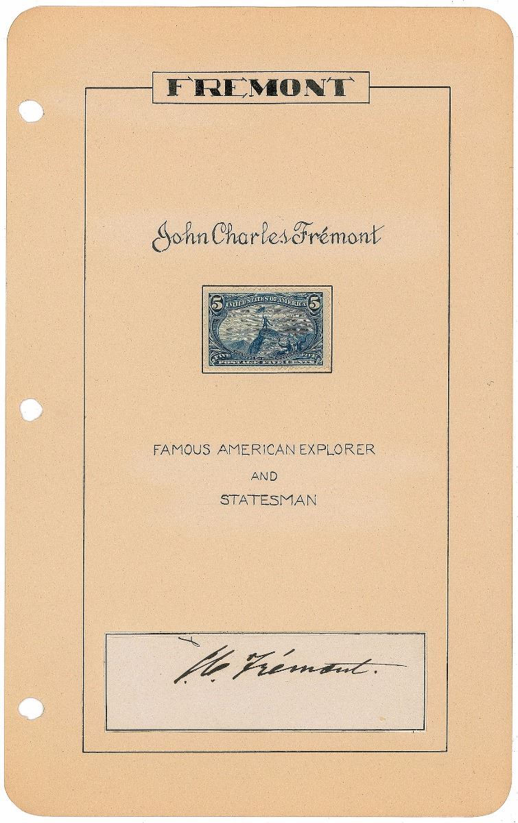 Ink signature, “J. C. Fremont,” on an off-white slip affixed to a 6 x 9.5 album page hand-embellished with a calligraphic title and postage stamp honoring the storied explorer and statesman. In fine condition.