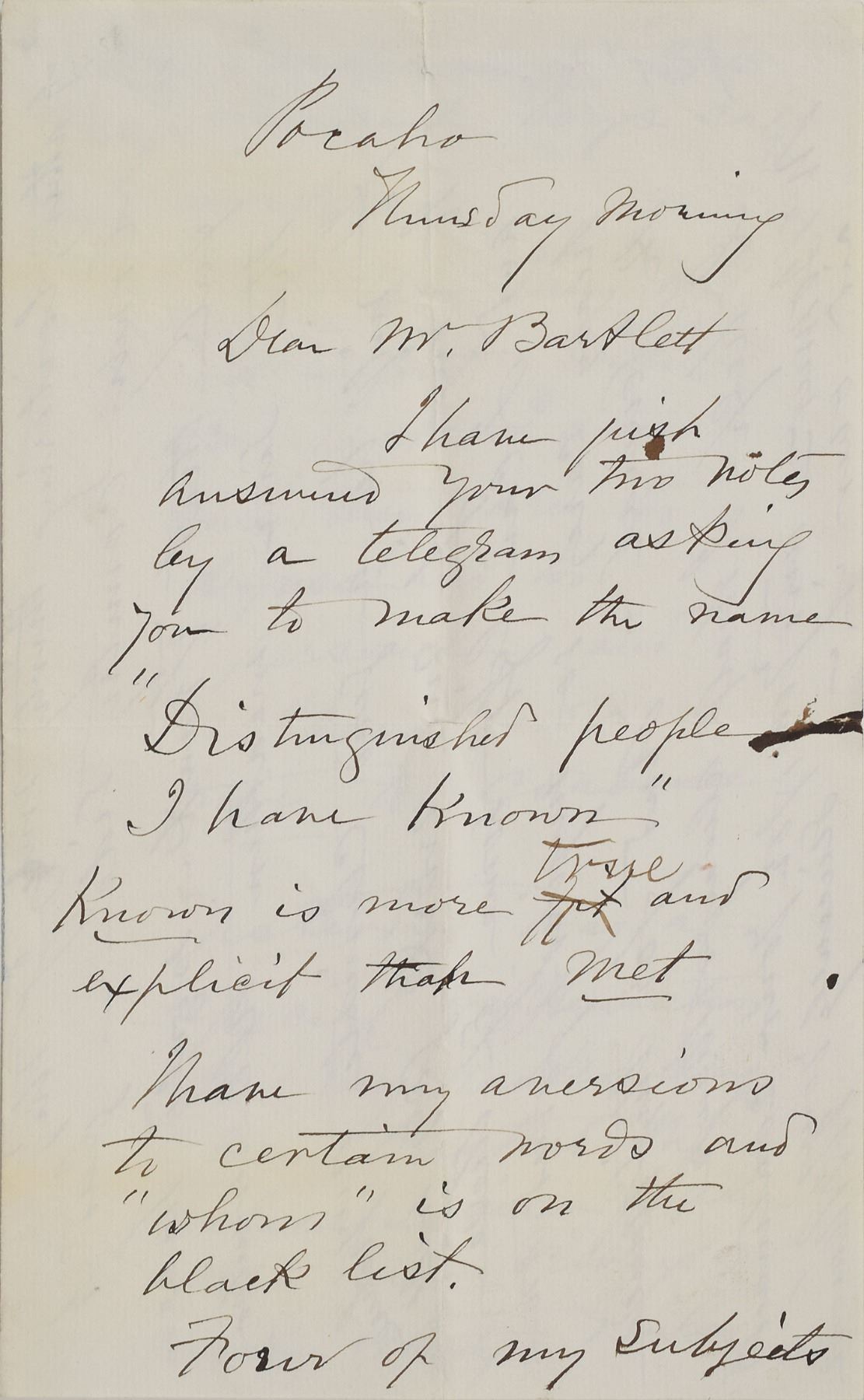 Wife of explorer and politician John C. Fremont (1824-1902), who was the daughter of the famed Senator Thomas Hart Benton, as well as an author of several popular memoirs and western stories. ALS signed “J. B. Fremont,” three pages on two adjoining sheets, 5 x 8.25, no date. Letter to Mr. Bartlett, in part: “I have just answered your two notes by a telegram asking you to make the name 'Distinguished People I Have Known.' Known is more true and explicit than Met. I have my aversions to certain words and ‘whom’ is on the black list. Four of my subjects are ‘materialized’ as my irreverent boys call my work. I hope they will do—but writing so fast I am sure they are too diffuse and too personal and I have not time to condense. Yesterday was a special dispensation for my Frank's boys. We breathed the delicious air together all day—driving nearly thirty miles, or rather, loitering thirty miles of this lovely country side—glad to feel that Frank would have the same weather all winter. It will be a good climate anywhere to me if my work goes well and I can lift some of these heavy cares so unjustly forced on the general. And for the chance to help I shall always thank Mr. Bowser and you, for your continued air over it." Although undated, the letter was written between 1864 and 1875, the period her family resided at Pocaho in the Hudson River Valley. Reverse of second integral page bears an ownership stamp from the famed Max Thorek Collection. In fine condition, with a bit of light toning. Accompanied by the original Max Thorek Autograph Collection folder.