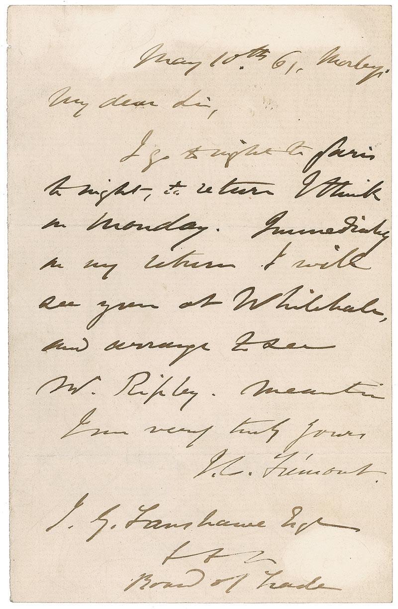 Prominent American explorer, military officer, and politician (1813–1890) who mapped the Oregon Trail, played a prominent part in conquering California during the Mexican War, and ran in 1856 as the first Republican presidential candidate. ALS signed “J. C. Fremont,” one page, 4.5 x 7, May 10, 1861. Fremont writes to a Mr. Fanshawe of the Board of Trade. In part: “I go tonight to Paris tonight, to return I think on Monday. Immediately on my return I will see you at Whitehall, and arrange to see Mr. Ripley.” In very good condition, with some creasing and light soiling (areas of erased soiling near top and bottom).