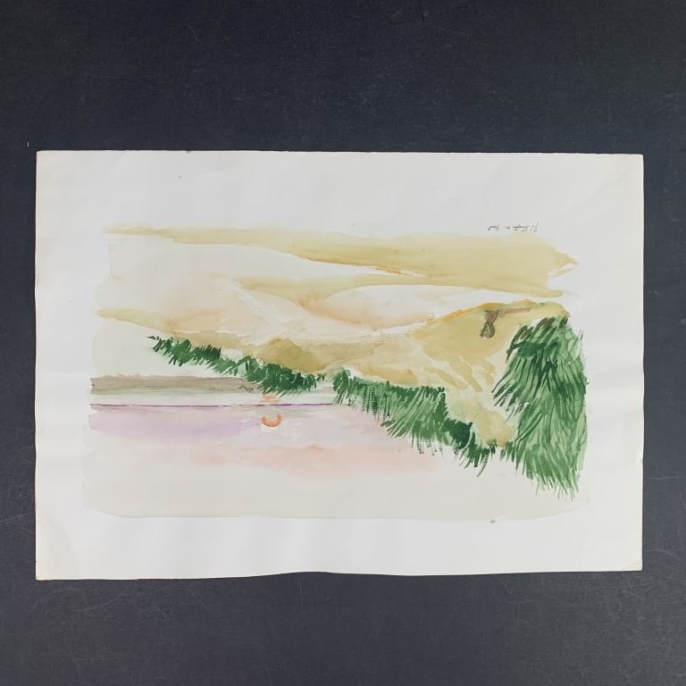 An original print by John C. Knapton, titled, signed and dated lower left. This piece is a scene of a beach with a small sandy hill with some grass. The ocean and setting sun are the in the background. This piece is in near excellent condition with extremely minor to very minor wrinkles.