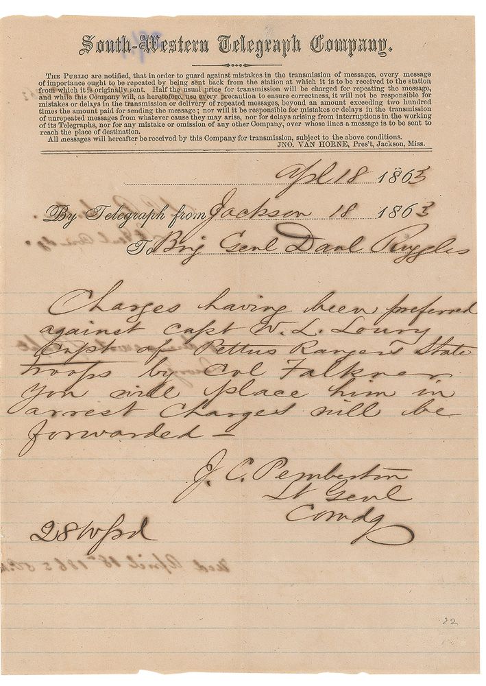 Confederate general (1814–1881) remembered for his defeat and surrender at the Siege of Vicksburg. War-dated ALS signed “J. C. Pemberton, Lt. Genl, Comdg,” one page, 5.5 x 7.75, South-Western Telegraph Company letterhead, April 18, 1863. Handwritten telegram to Brigadier General Daniel Ruggles. In full: “Charges having been preferred against Capt W. L. Lowry Capt of Pettus Rangers State Troops by Col. Falkner you will place him in arrest charges will be forwarded.” Professionally inlaid into an off-white 6.75 x 8.25 sheet. Central vertical and horizontal folds, the vertical fold passing through a single letter of the signature, some show-through from docketing and ink notations to reverse, and slight haloing to most of the ink, otherwise fine condition.