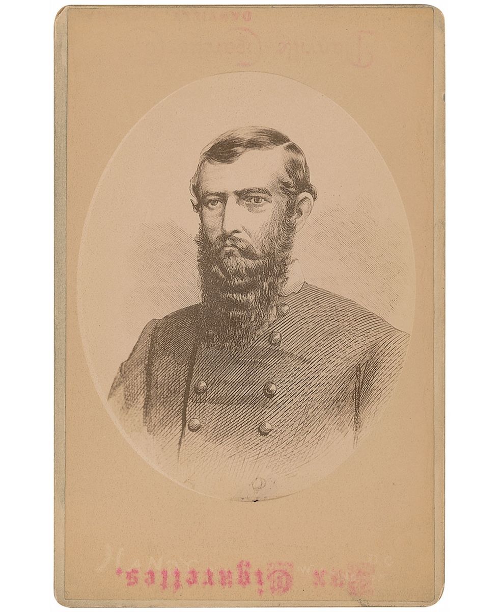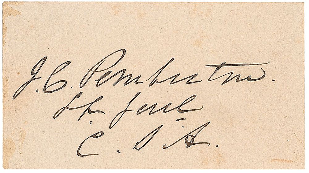 Confederate general (1814–1881) remembered for his defeat and surrender at the Siege of Vicksburg. Bold ink signature, “J. C. Pemberton, Lt. Genl, C. S. A.,” on an off-white 3 x 1.75 card. In fine condition, with scattered toning. Accompanied by an unsigned original cabinet photo of Pemberton.
