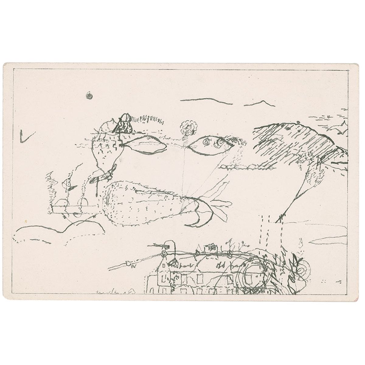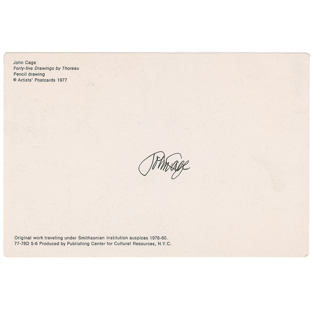 Postcard of Cage’s Forty-five Drawings by Thoreau, 6 x 4, signed on the reverse in black ink. In fine condition.