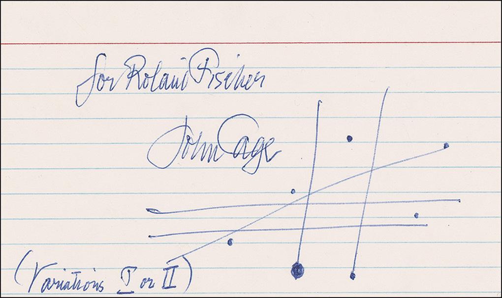 Highly influential avant-garde American composer and artist (1912–1992). AMQS on an off-white 5 x 3 lined card. Cage pens a quote from Variations II consisting of several dots and intersecting lines. Signed and inscribed “For Roland Fischer, John Cage.” In very fine condition.