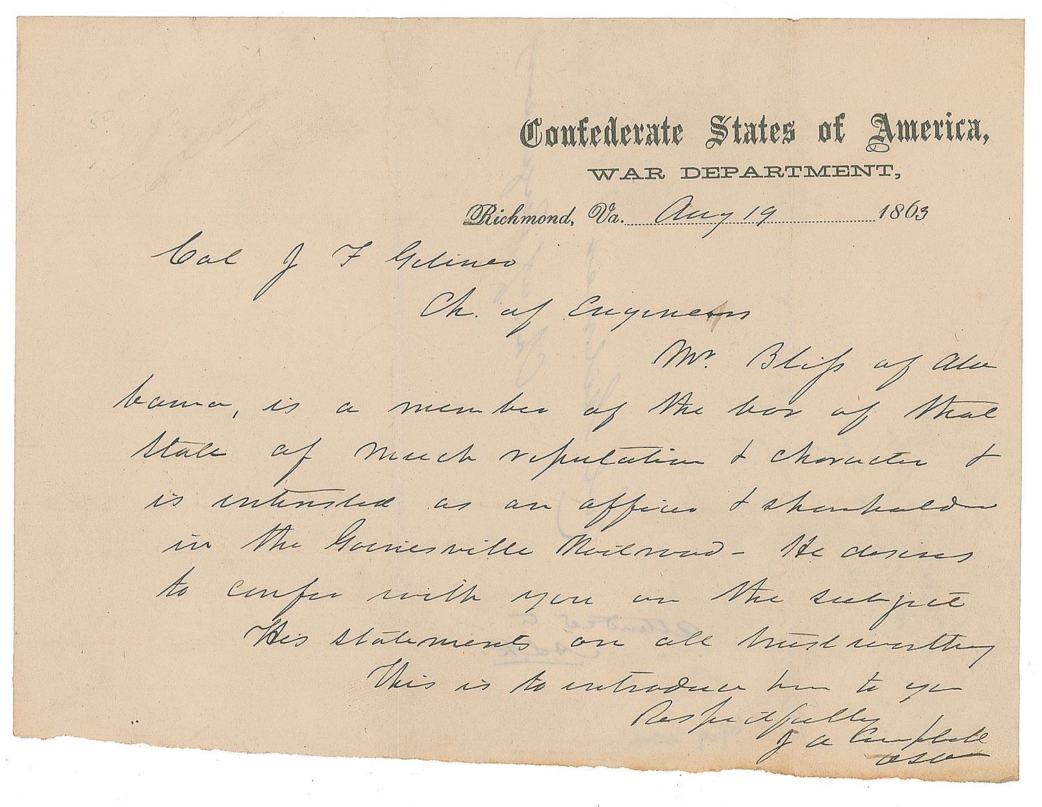 Civil War–dated ALS signed “J. A. Campbell,” one page, 7 x 5.25, Confederate States of America War Department letterhead, August 19, 1863. Letter to Col. Jeremy Francis Gilmer, chief engineer of the Confederate States Army, in full: "Mr. Bliss of Alabama, is a member of the bar of that state of much reputation & character & is entrusted as an officer & shareholder in the Gainesville Railroad—He desires to confer with you on the subject. His statements are all trustworthy. This is to introduce him to you." In fine condition, with a crease to the lower left corner.