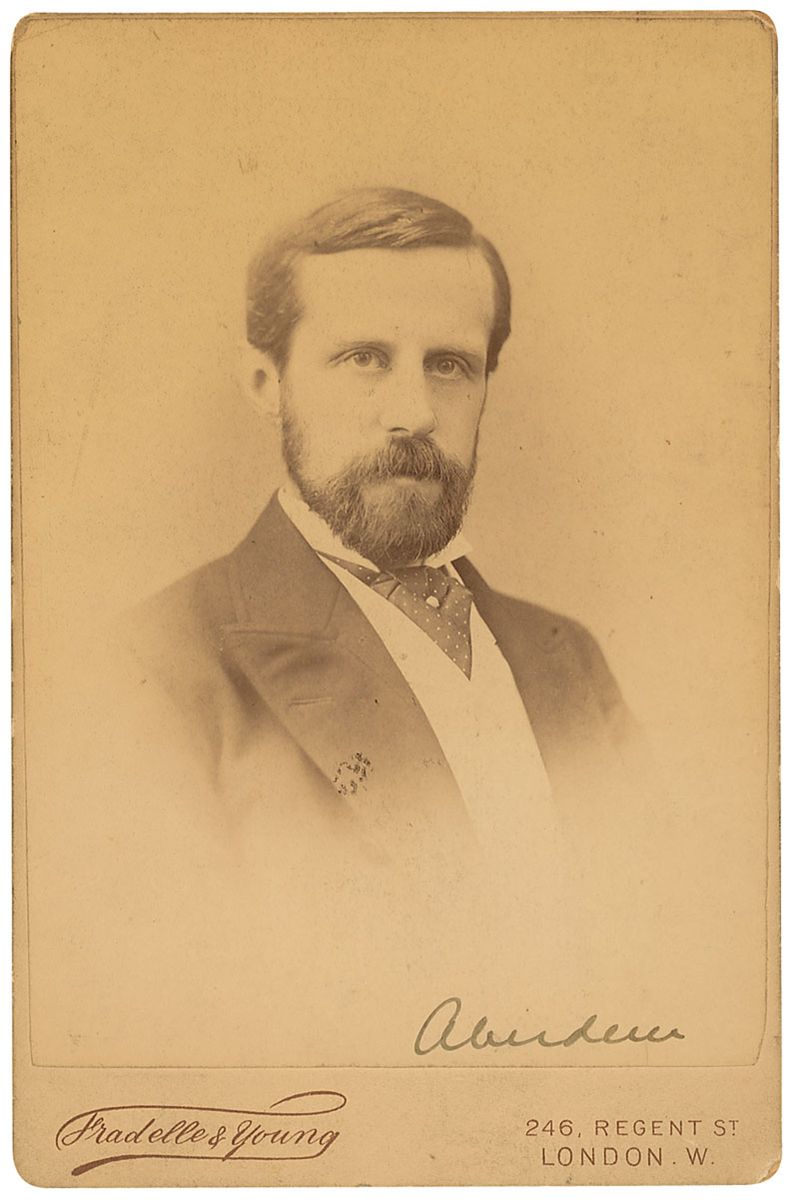 Scottish politician (1847–1934) who served as Lord Lieutenant of Ireland and the seventh Governor General of Canada. Original 4.5 x 6.5 cabinet photo by Fradelle & Young of London, signed at the bottom of the image in black ink, “Aberdeen.” In fine condition.