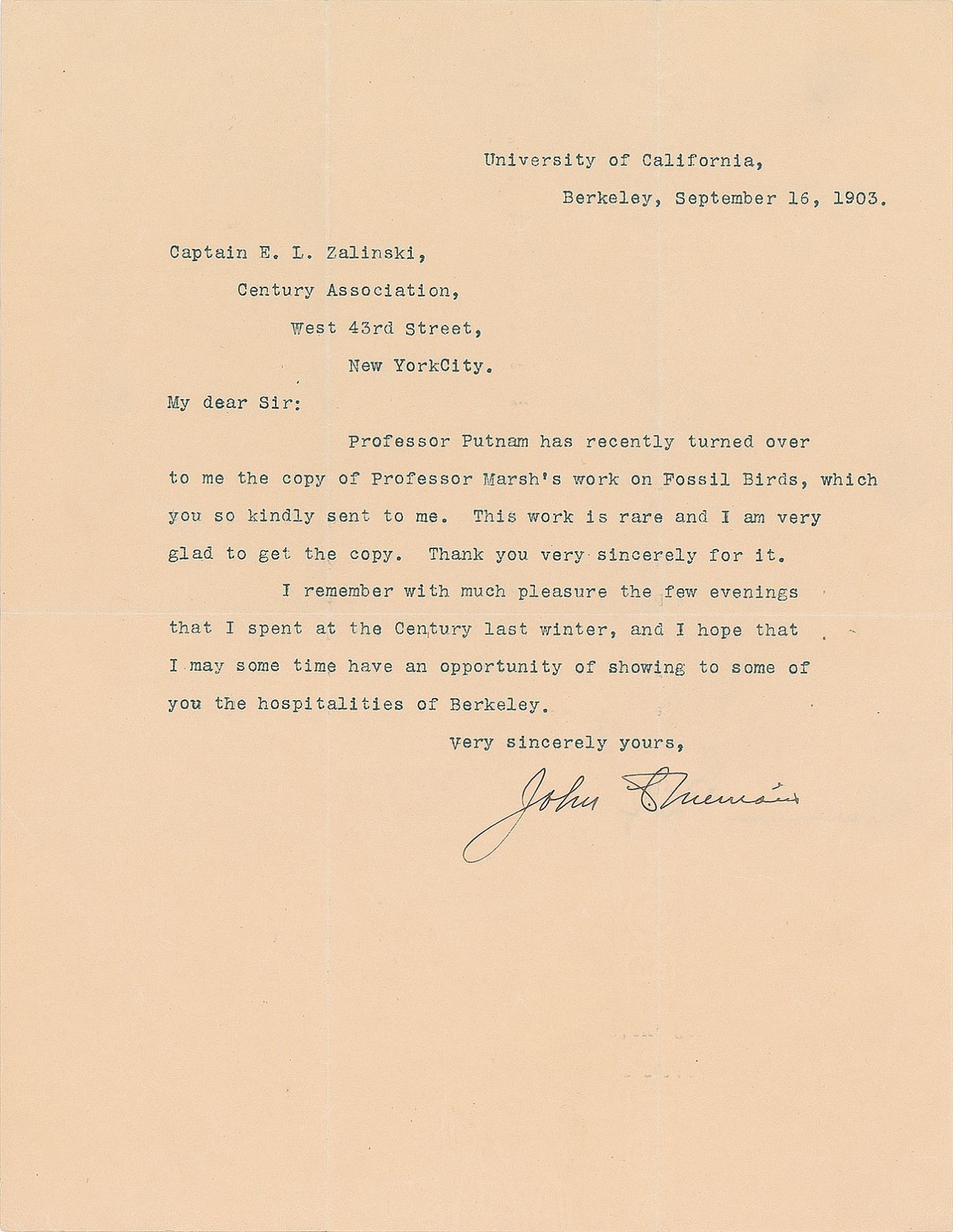 American paleontologist, educator, and conservationist (1869–1945) best known for his taxonomy of vertebrate fossils at the La Brea Tar Pits in Los Angeles. TLS signed “John C. Merriam,” one page, 8.5 x 11, September 16, 1903. Letter to Captain E. L. Zalinski, in part: "Professor Putnam has recently turned over to me the copy of Professor Marsh's work on Fossil Birds, which you so kindly sent to me. This work is rare and I am very glad to get the copy. Thank you very sincerely for it." In fine condition, with some light creasing.