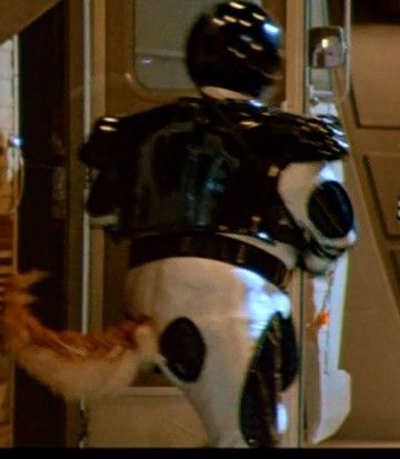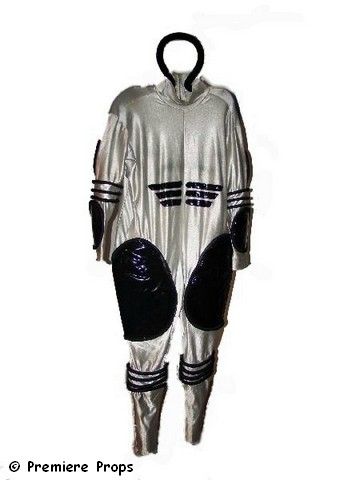 This is a true treasure! From Mel Brook’s beloved “Spaceballs” (1987). Filled with wonderful comic actors, and great parody’s of Star Wars icons, the most popular  was John Candy as Barf, playing a half-man, half-dog (as he says, that made him his own best friend). As an obvious nod to Star War’s Chewbacca, Barf is Lone Star’s (Bill Pullman’s) constant companion.  When hero Lone Star, and Barf infiltrated Dark Helmet’s (Rick Moranis) headquarters, they do the big movie cliché “sneak attack” by overcoming two guards, and then putting on their uniforms to get inside. Of course the big joke is that Barf’s guard is half his size, however his uniform still fits (and just happens to have a hole for his tail)! This is John Candy’s hero screen used silver guard jumpsuit that he wears throughout the battle scenes in Helmet’s complex.  It is made of spandex with retro 1950’s “B” space movie mandatory black raised stripes and ribbing, along with huge black plastic circles with clear plastic, and of course a hole at the rear for his “Cowardly Lion” like tail. The costume has “JC #1” on the inside collar. And a zipper. An interesting note: the costume also has a small tear over the rear end on the right side. It has been repaired, and actually if you look carefully in the movie, you can actually see the repair on the screen. If only Candy was around today to tell us how he got it! The suit comes with a formal Certificate of Authenticity. And it comes in extra large “John Candy” Size”.  This is a rare and truly wonderful.  This is an oversized costume and will require extra shipping charges. (Approx. 61x23).