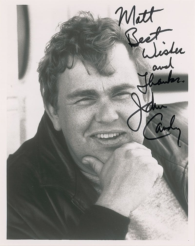 Glossy 8 x 10 photo, signed and inscribed in black felt tip, “Matt, Best wishes and thanks, John Candy.” In fine condition.