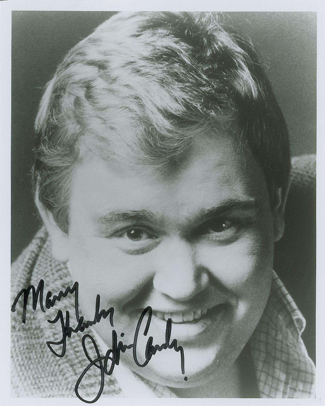 Glossy 8 x 10 close-up photo of the Hollywood funnyman, signed in black felt tip, "Many Thanks, John Candy." In fine condition.
