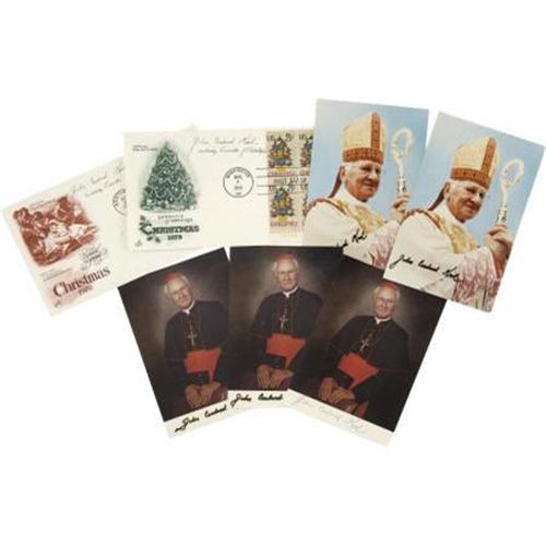 <B>John Cardinal Krol Autograph Archive.</B></I> Lot includes five signed color photographs, three 3.5" x 5", two 3.5" x 5.5, all signed <I>"John Cardinal Krol". </B></I>Also included in this lot are two postmarked first day covers, "<I>Christmas 1973"</B></I> and "<I>Christmas 1976"</B></I>, both signed "<I>John Cardinal Krol/ Archbishop Emeritus of Philadelphia".</B></I> All seven lots in fine condition.<BR><BR><b>Shipping:</b> Flat Material, Small (<a target="_blank" href="http://www.heritageauctions.com/common/shipping.php">view shipping information</a>)