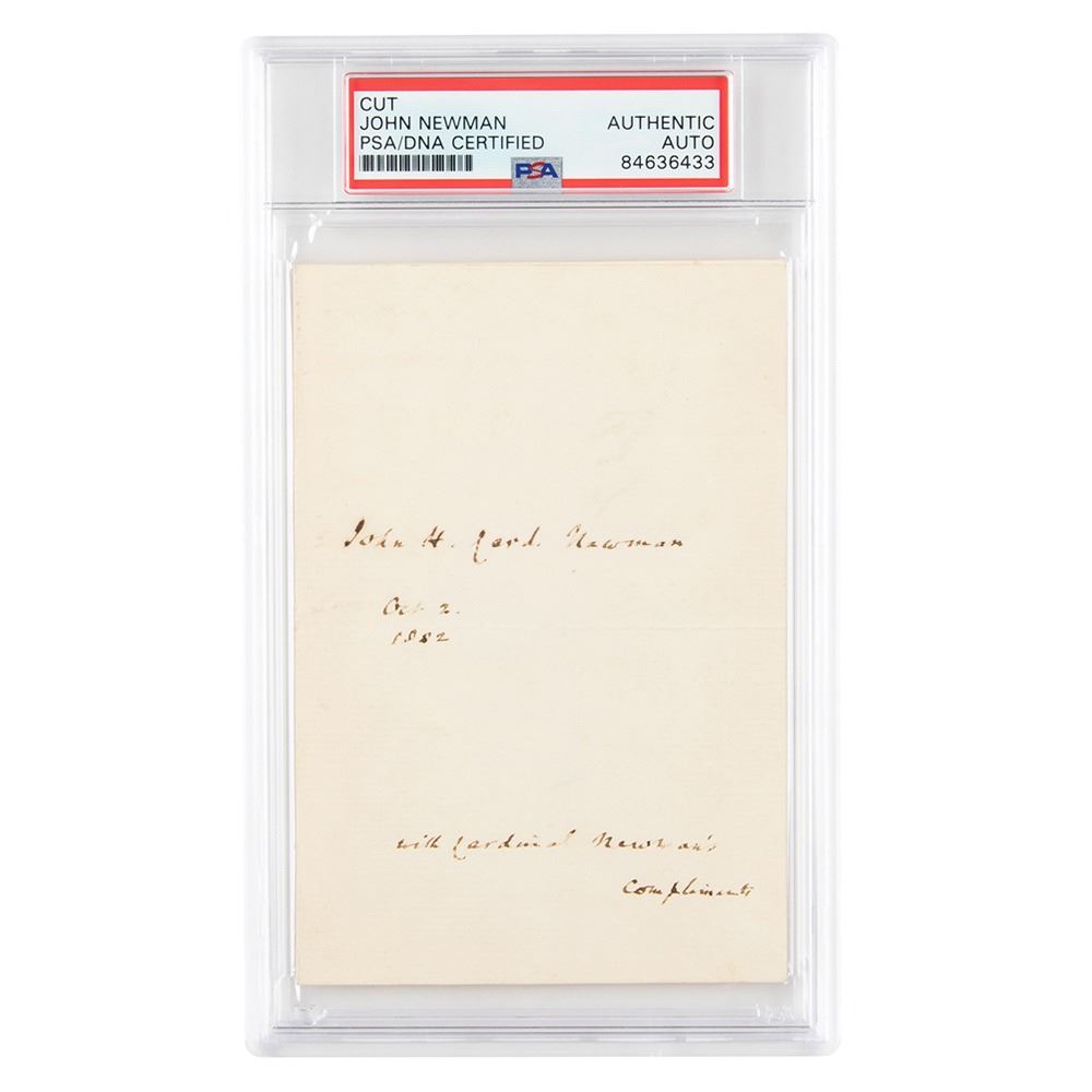 Ink signature, "John H. Card. Newman, Oct. 2, 1882, with Cardinal Newman's Compliments,†on an off-white 3.5 x 5 sheet. In fine condition. Encapsulated in a PSA/DNA authentication holder.